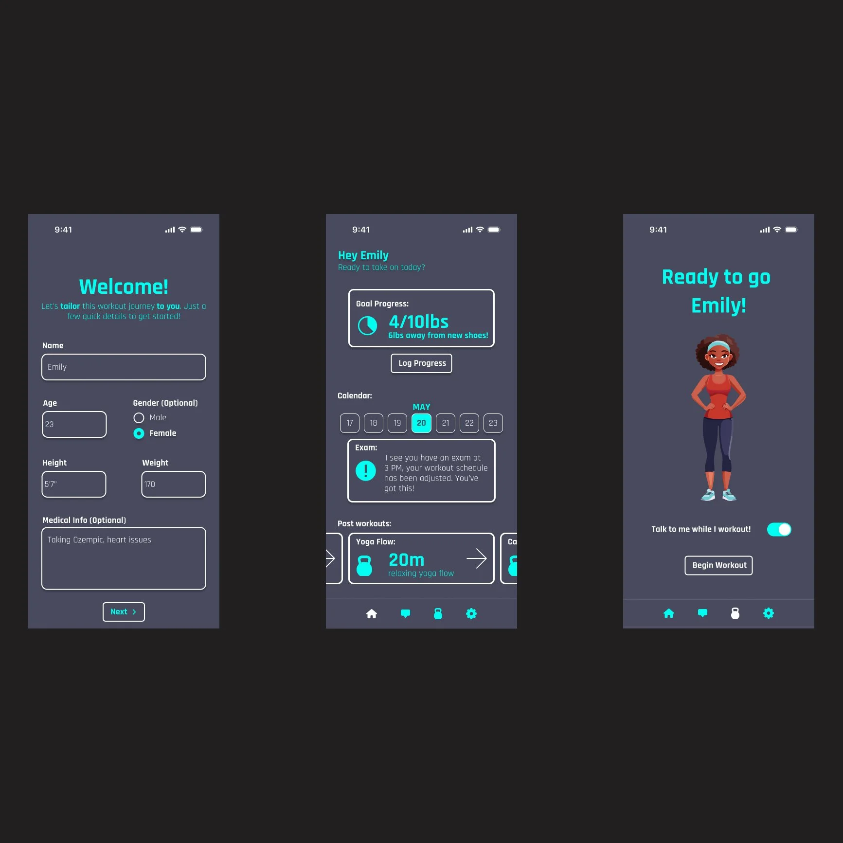 For our final design, my partner and I were asked to split up and create two versions of the app. Below is my final design. For my version of the app, I wanted to emphasize personalization so that the user can feel they truly are getting a fitness coach out of our app.